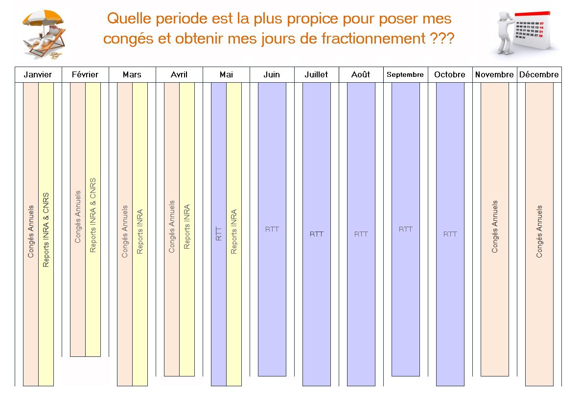 Vous vous posez des questions concernant la meilleure période pour prendre les reports, les RTT ou bien la meilleure période pour poser vos congés annuels et acquérir les jours de fractionnement ? A savoir que lorsque le nombre de jours de congé annuel pris en dehors de la période allant du 1er mai au 31 octobre est au moins égal à huit jours, il est attribué deux jours de congé supplémentaires. Lorsque le nombre de jours de congé pris en dehors de cette même période varie entre cinq et sept jours, il est accordé un jour de congé supplémentaire.