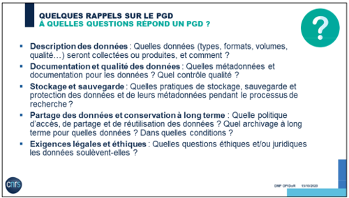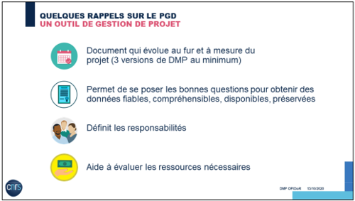 ➢ PGD1 (6 mois) : description de l’organisation définie pour la gestion des jeux de données identifiés à l’échelle du projet, éventuellement au delà (voir l’onglet Créer son Plan de Gestion de données) - En cours de projet : actualiser les jeux de données et les données associées